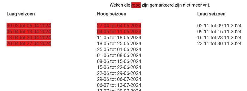 Deze is per week aangegeven, en onderverdeeld in het laag- en hoogseizoen. Zo kunt u snel zien of uw gewenste periode nog vrij is